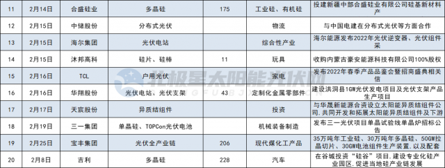 其他如多晶硅、硅片制造領(lǐng)域投資共7家,分別為合盛硅業(yè)、吉利、其亞集團(tuán)、清電能源、中啟控股、風(fēng)范股份、華民股份。光伏設(shè)備5家,分別為山東大業(yè)股份、東威科技、拓普集團(tuán)、奧??萍?、金鴻順。光伏膠膜3家,分別為中石化、信義儲電、綠康生化;此外,江蘇陽光、寶豐大手筆投資全產(chǎn)業(yè)鏈。
