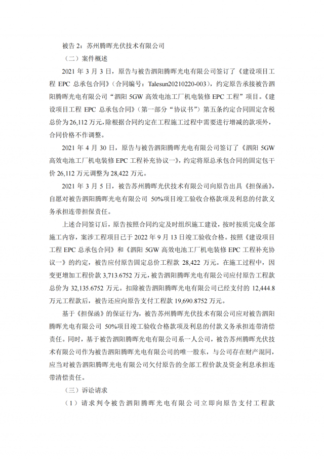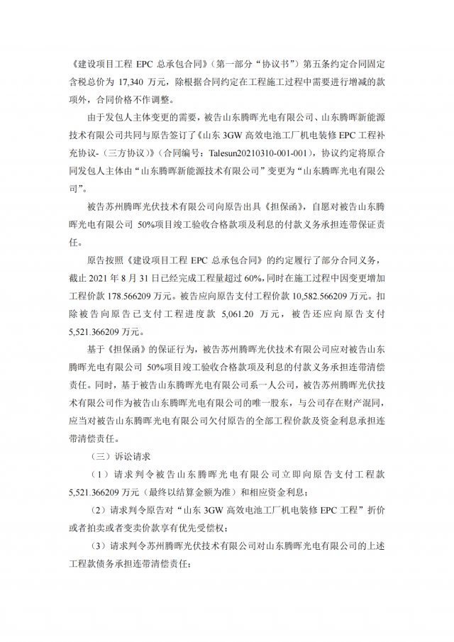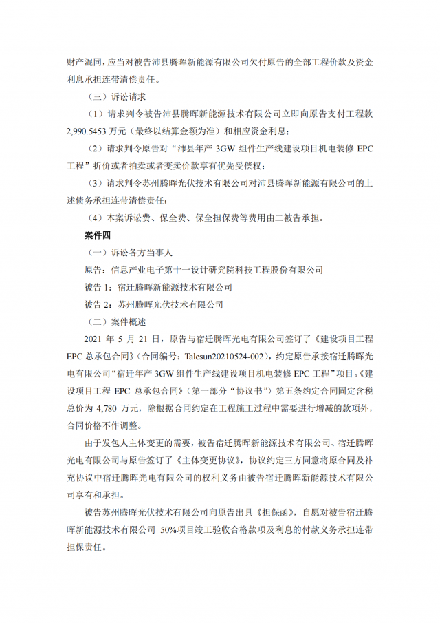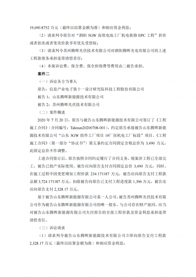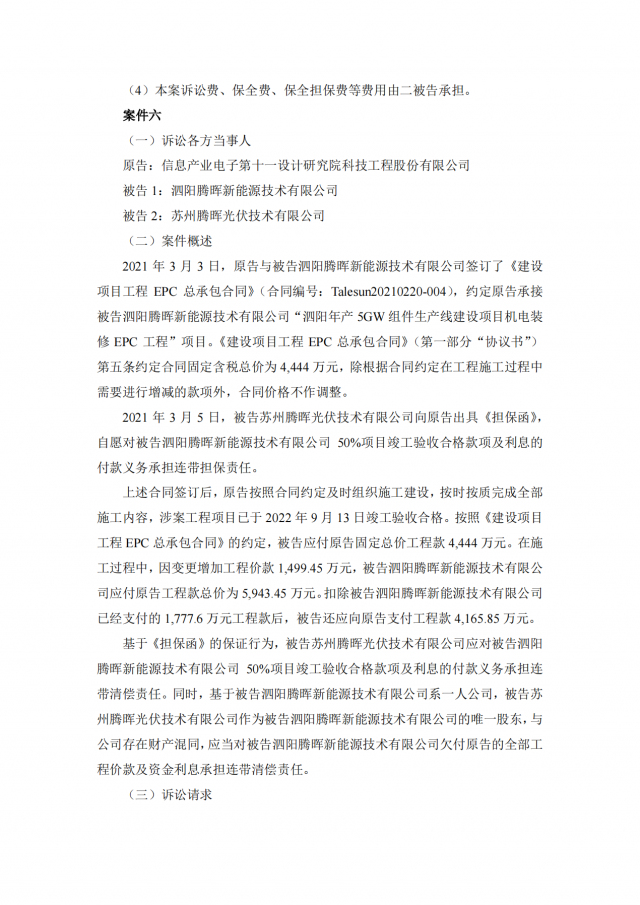 2020年~2021年期,十一科技與蘇州騰暉的六家全資子公司泗陽(yáng)騰暉光電有限公司、山東騰暉新能源技術(shù)有限公司、沛縣騰暉新能源技術(shù)有限公司、宿遷騰暉新能源技術(shù)有限公司、山東騰暉光電有限公司、泗陽(yáng)騰暉新能源技術(shù)有限公司簽訂了多筆項(xiàng)目施工承包合同,但上述六家企業(yè)并未全部付清工程款。