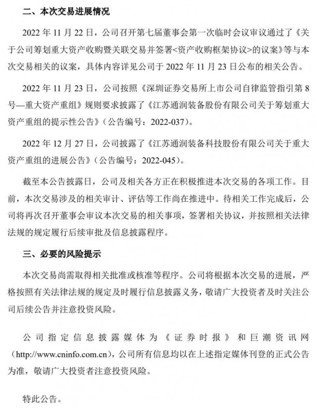 2022年12月27日,公司披露了《江蘇通潤(rùn)裝備科技股份有限公司關(guān)于重大資產(chǎn)重組的進(jìn)展公告》。截至本公告披露日,公司及相關(guān)各方正在積極推進(jìn)本次交易的各項(xiàng)工作。目前,本次交易涉及的相關(guān)審計(jì)、評(píng)估等工作尚在推進(jìn)中。待相關(guān)工作完成后,公司將再次召開董事會(huì)審議本次交易的相關(guān)事項(xiàng),簽署相關(guān)協(xié)議,并按照相關(guān)法律法規(guī)的規(guī)定履行后續(xù)審批及信息披露程序。