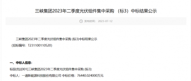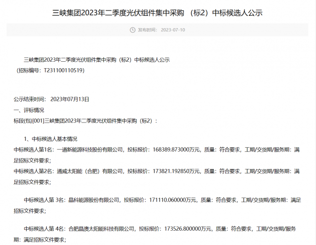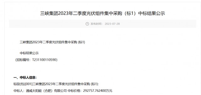 7月28日,三峽2023年二季度光伏組件集中采購(標1)中標結果公示,通威以1.3元/瓦的報價獨享2249.4MW的光伏組件訂單,組件型號為P型545W+雙面。