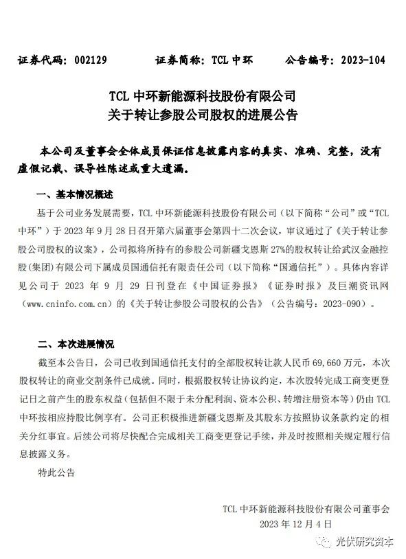 12月4日消息, TCL中環(huán)發(fā)布公告稱,公司已成功轉(zhuǎn)讓其所持有的新疆戈恩斯27%的股權(quán)給武漢金融控股(集團(tuán))有限公司下屬的國通信托有限責(zé)任公司,并已收到全部股權(quán)轉(zhuǎn)讓款人民幣6.97億元。根據(jù)股權(quán)轉(zhuǎn)讓協(xié)議,TCL中環(huán)在完成工商變更登記日之前仍享有相應(yīng)股東權(quán)益。公司目前正在積極推進(jìn)分紅事宜,并將盡快完成相關(guān)工商變更登記手續(xù)。