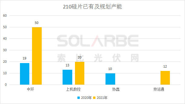 通過梳理現(xiàn)有以及規(guī)劃中的210產(chǎn)能,索比光伏網(wǎng)發(fā)現(xiàn),2020年底中環(huán)、上機(jī)數(shù)控、協(xié)鑫三家的210硅片產(chǎn)能已達(dá)42GW,2021年210硅片產(chǎn)能規(guī)劃已超92GW。由此看來,2021年210大尺寸硅片迭代速度將超乎預(yù)期。