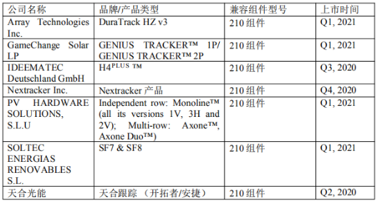 本次發(fā)布適配210組件的跟蹤支架品牌、適配產(chǎn)品及上市時(shí)間如下(按英文首字母排序):