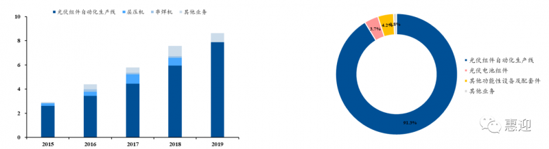 多主柵串焊機(jī)逐步成為公司光伏設(shè)備中的主要構(gòu)成產(chǎn)品。2018 年,公司多主柵串焊機(jī)開始放量,在公司光伏設(shè)備收入中占比約為 5.88%,2019 年,公司多主柵串焊機(jī)收入從 0.2 億元提升至 2.52 億元,占光伏設(shè)備收入中的 40.91%,超越常規(guī)串焊機(jī),成為公司光伏設(shè)備業(yè)務(wù)中占比最高的業(yè)務(wù),成為公司的營(yíng)業(yè)收入中占比最高的業(yè)務(wù)。未來(lái),公司的串焊機(jī)有望深度受益于光伏組件技術(shù)迭代,在新一輪市場(chǎng)擴(kuò)展中占據(jù)優(yōu)勢(shì)地位。