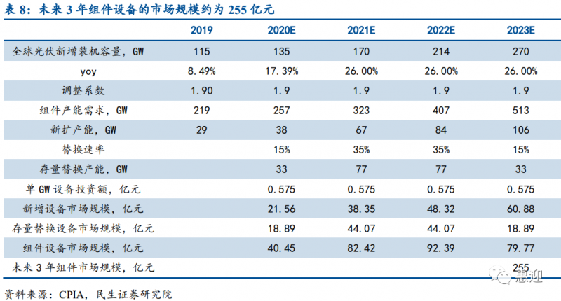 經(jīng)民生證券測(cè)算,預(yù)計(jì) 2021 年、2022 年、2023 年組件設(shè)備的市場(chǎng)規(guī)??煞謩e達(dá)到 82.42 億元、92.39 億元和 79.77 億元,未來(lái) 3 年組件設(shè)備的市場(chǎng)規(guī)模合計(jì)可達(dá) 255 億元,組件設(shè)備廠商擁有廣闊的發(fā)展前景。