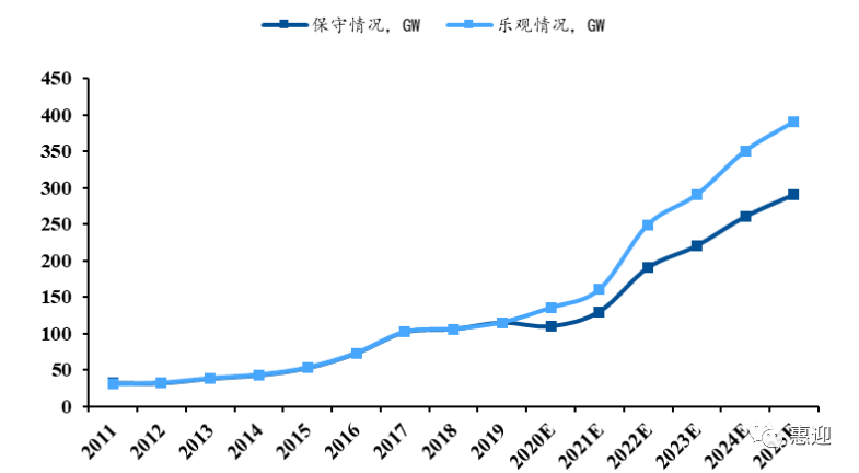 光伏行業(yè)降本提效穩(wěn)步推進(jìn),疊加全球各國(guó)可再生能源政策的頒布與執(zhí)行,預(yù)計(jì)全球光伏累計(jì)裝機(jī)容量將繼續(xù)保持增長(zhǎng)態(tài)勢(shì),根據(jù) CPIA 的預(yù)測(cè),“十四五”期間,樂觀預(yù)期下,全球光伏裝機(jī)規(guī)模年均新增 287GW,中性情況下年均新增 222GW。該預(yù)期與 IRENA 于 2019 年年在分析報(bào)告《光伏的未來(lái)》給出的預(yù)測(cè)基本一致,IRENA 認(rèn)為,到 2030 年光伏的裝機(jī)目標(biāo)將達(dá)到 8500GW,年均光伏新增規(guī)模將超過(guò) 250GW。