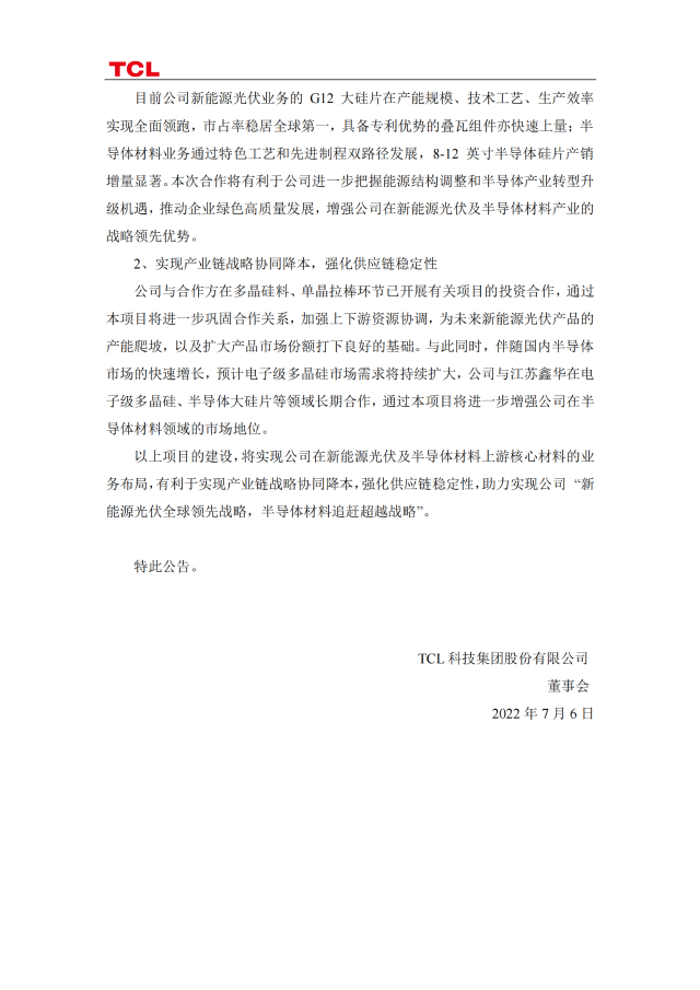 7月7日,TCL科技發(fā)布公告稱,今年4月與協(xié)鑫集團(tuán)有限公司及關(guān)聯(lián)方簽訂《合作框架協(xié)議書》,就投資新建光伏級和電子級硅料項(xiàng)目開展合作。