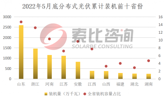 而分布式光伏方面,截至2022年5月底,累計(jì)裝機(jī)排名前三的省份分別是山東、浙江,江蘇,累計(jì)裝機(jī)分別為25.9GW、14.7GW、11.6GW。