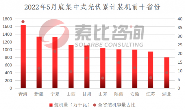 其中,集中式光伏方面,截至2022年5月底,累計(jì)裝機(jī)排名前三的省份分別是青海、新疆、寧夏,累計(jì)裝機(jī)分別為16.4GW、13.4GW、13.3GW。