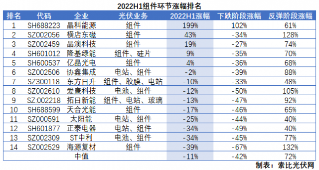 值得注意的是,同樣受硅料價格暴漲盈利能力承壓的組件環(huán)節(jié)的表現(xiàn)遠不及電池片環(huán)節(jié),平均漲幅僅為-11%,其中缺少全球化渠道布局的二三線廠商跌幅居前,而晶科能源、晶澳科技、隆基綠能三大組件巨頭均取得了正收益,但除了剛剛上市的晶科能源以外,漲幅相對有限。