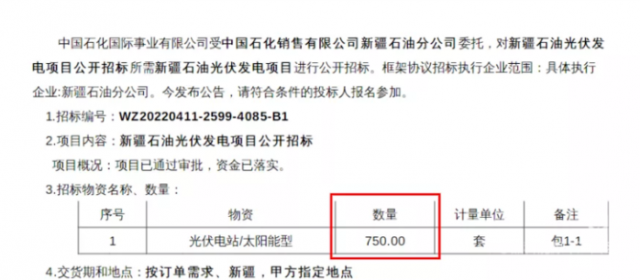 2022年4月1日,中國(guó)石化銷(xiāo)售有限公司新疆石油分公司公開(kāi)招標(biāo)750套新疆石油光伏發(fā)電項(xiàng)目。
