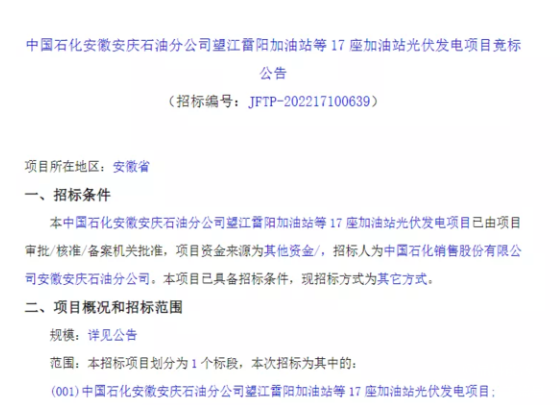 2022年9月28日,中國(guó)石化安徽安慶石油分公司望江雷陽(yáng)加油站等17座加油站光伏發(fā)電項(xiàng)目競(jìng)標(biāo)公告發(fā)布:
