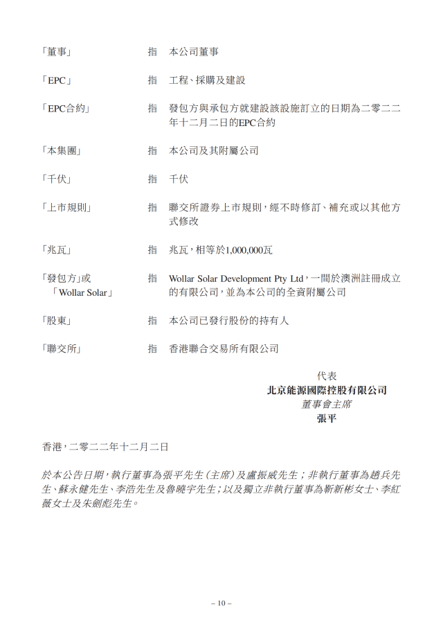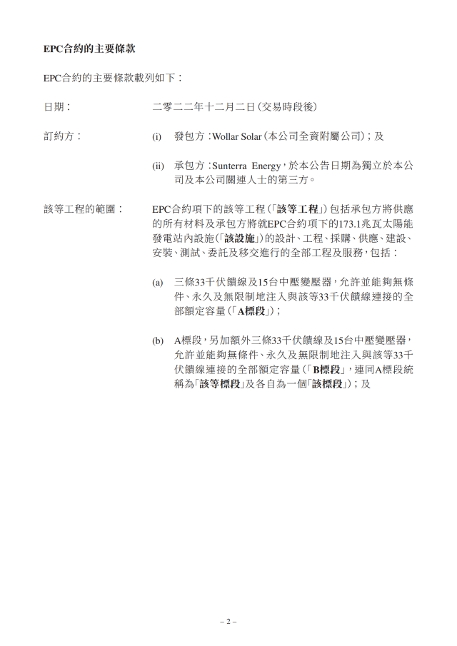 12月2日,北京能源國(guó)際發(fā)布公告稱(chēng),于2022年12月2日公司全資附屬公司W(wǎng)ollar Solar,作為發(fā)包方與承包方Sunterra Energy訂立EPC合約。
