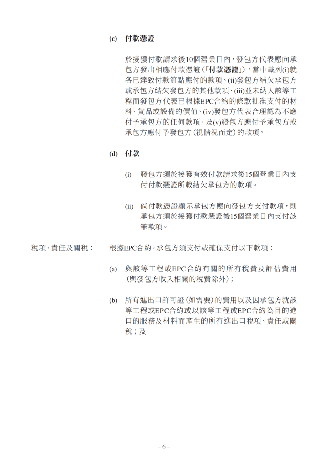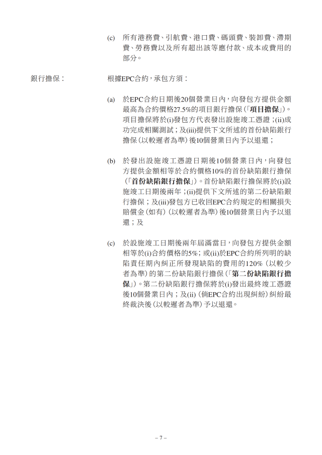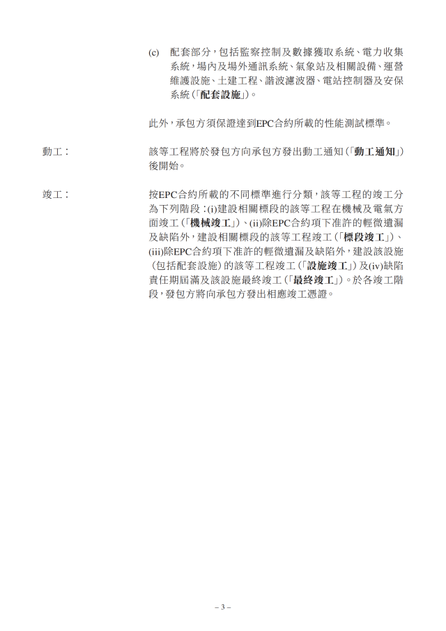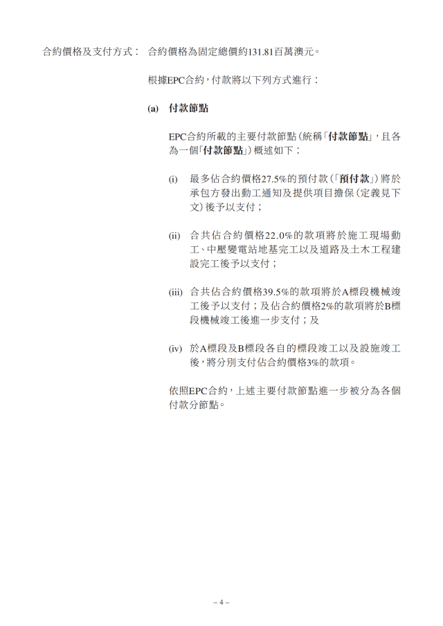 此EPC合約的合約價(jià)格約為1.32億澳元,當(dāng)前匯率折算約合6.17億元人民幣,設(shè)施為EPC合約項(xiàng)下的173.1兆瓦太陽(yáng)能發(fā)電站內(nèi)設(shè)施的設(shè)計(jì)、工程、采購(gòu)、供應(yīng)、建設(shè)、安裝、測(cè)試、委托及移交進(jìn)行的全部工程及服務(wù)。