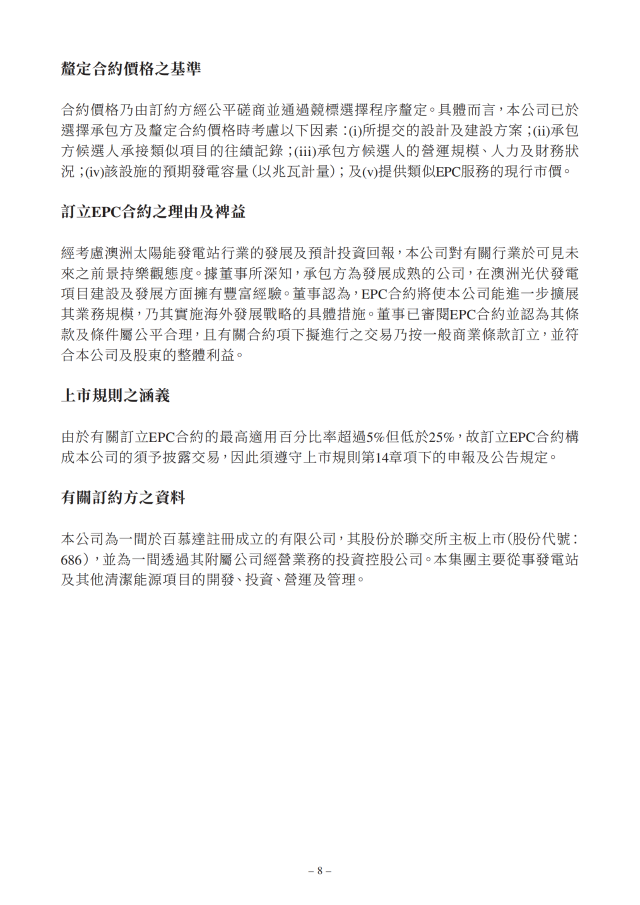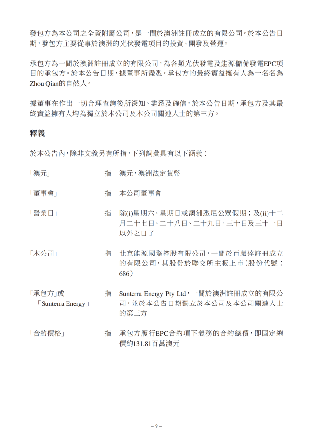 北京能源國(guó)際在公告中表示,經(jīng)考慮澳洲太陽(yáng)能發(fā)電站行業(yè)的發(fā)展及預(yù)計(jì)投資回報(bào),公司對(duì)有關(guān)行業(yè)于可見(jiàn)未來(lái)的前景持樂(lè)觀態(tài)度。據(jù)董事所深知,承包方為發(fā)展成熟的公司,在澳洲光伏發(fā)電項(xiàng)目建設(shè)及發(fā)展方面擁有豐富經(jīng)驗(yàn)。董事認(rèn)為,EPC合約將使公司能進(jìn)一步擴(kuò)展其業(yè)務(wù)規(guī)模,乃其實(shí)施海外發(fā)展戰(zhàn)略的具體措施。董事已審閱EPC合約并認(rèn)為其條款及條件屬公平合理,且有關(guān)合約項(xiàng)下擬進(jìn)行的交易乃按一般商業(yè)條款訂立,并符合公司及股東的整體利益。