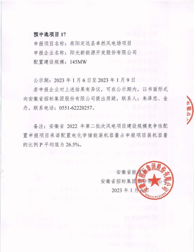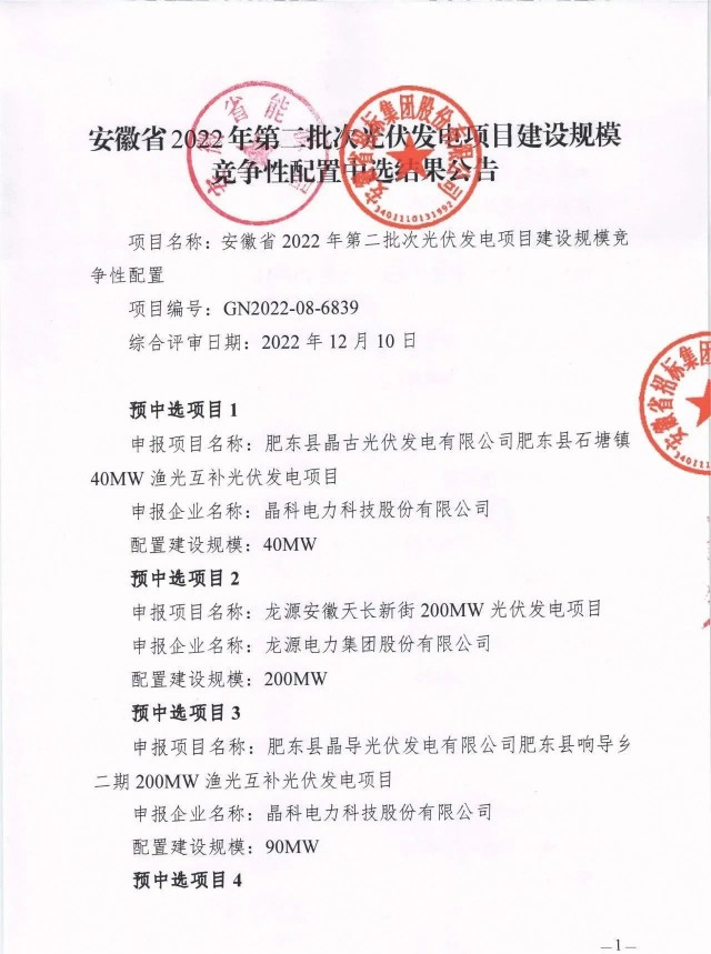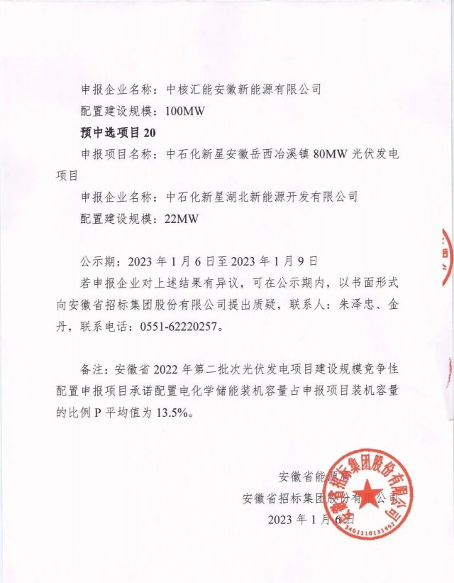 1月6日,安徽省能源局公示了2022年第二批光伏、風(fēng)電項(xiàng)目競(jìng)爭性配置優(yōu)選結(jié)果,共計(jì)37個(gè)項(xiàng)目入選,其中光伏規(guī)模為1.5GW,項(xiàng)目20個(gè);風(fēng)電項(xiàng)目規(guī)模為1.5GW,項(xiàng)目17個(gè)。