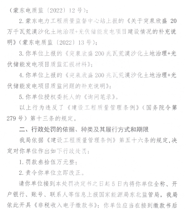 日前,東北能源監(jiān)管局向突泉欣盛太陽能發(fā)電有限公司開出一張罰單,經(jīng)調(diào)查核實(shí),你單位投資建設(shè)的突泉欣盛200兆瓦荒漠沙化土地治理+光伏儲能發(fā)電項(xiàng)目未按照國家有關(guān)規(guī)定辦理工程質(zhì)量監(jiān)督手續(xù)。
