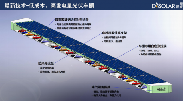 在第六屆分布式能源嘉年華上,一道新能源系統(tǒng)工程創(chuàng)新研究院院長韓利生分享了零碳服務區(qū)的光儲充一體化停車場解決方案。他表示一道新能推出的停車區(qū)光伏解決方案,以高效、美觀、便捷為理念,對于常規(guī)停車棚造價高、發(fā)電量低、設計感缺失等缺點進行了針對性優(yōu)化。首先,采用中跨距柔性高支架代替常規(guī)短跨距鋼架式結構,降低了造價,同時為N型雙面鋼邊框組件提供最佳傾角,確保整面發(fā)電量最優(yōu);其次,布置白色張拉膜作為防曬防雨材料,并利用其反光特性,增加雙面組件的背面發(fā)電量;最后,采用防風導流板、安全隔離護板等結構,將光伏組件迎風面和地面電氣設備保護起來,既提高了安全性、又增加了美觀性。