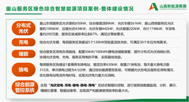 舉例來說,崮山服務案區(qū)綠色綜合智慧能源項目位于濟南長清區(qū)京臺高速段,占地約260 畝,其中,東側服務區(qū)較為狹長,西側服務區(qū)背靠崮 云湖,周邊旅游資源豐富,西側服務區(qū)內已建成酒店和觀光廊道。崮山服務區(qū)年用電量約300萬度,折合年碳排放量約2653噸,服務區(qū)當前變壓器總容量為4500kVA。崮山服務區(qū)已建成充電樁共8個、污水處理設施、多聯(lián)機中央空調系統(tǒng)等,本次建設內容包括分布式光伏、 儲能、充電站、換電站、綜合能源管理系統(tǒng)等。實現(xiàn)“光伏發(fā)電-充電-儲電-換電-用電”的動態(tài)智能化控制,進行碳排放數(shù)據(jù)監(jiān)視、分析、展示、精細化管理、智能運維等,實現(xiàn)資產和能源使用效率的最大化。