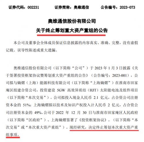 近日,奧維通信發(fā)布公告稱,公司原擬與熵熠(上海)能源科技有限公司(以下簡稱“上海熵熠”)在淮南市田家庵區(qū)組建合資公司,投資建設(shè)5GW高效異質(zhì)結(jié)(HJT)太陽能電池及組件項目。鑒于交易各方未能就交易對價、業(yè)績承諾、投后管理等交易方案的核心條款達(dá)成一致意見,為保證各方的利益,決定終止本次重大資產(chǎn)重組事項。