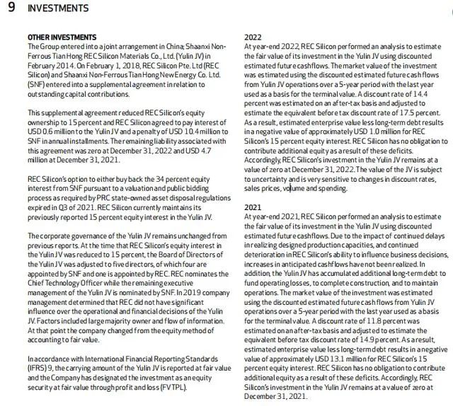 而REC硅披露了其參與公司運營情況。根據年報,REC硅通過分析估算得出,天宏瑞科的企業(yè)價值減去長期債務后,REC硅所持15%的股權價值在2021年約為負1310萬美元,2022年則為負100萬美元,REC稱自己沒有必要再為此赤字進行額外股本投資。
