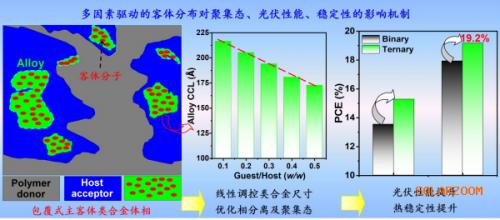 進(jìn)一步,研究對外圍功能化的客體分子主骨架進(jìn)行再調(diào)控,獲得了高質(zhì)量的類合金體相,同時,類合金聚集體的晶域尺寸可以通過客體摻雜比例進(jìn)行線性調(diào)控(圖2)。相比受體相內(nèi)同時存在客體自聚集區(qū)域及類合金區(qū)域,該研究中客體分子與主體受體具有高度兼容性。實驗結(jié)果分析顯示幾乎所有的客體分子均參與類合金體相的構(gòu)建,這是類合金晶域尺寸可以線性調(diào)控的本質(zhì)原因。同時,客體分子摻雜后,無論是主體聚合物給體還是主體受體的結(jié)晶性均得到增強,促進(jìn)了垂直方向空穴和電子的傳輸。此外,客體分子形成的類合金聚集體均包覆在主體受體相內(nèi),形成了核殼結(jié)構(gòu)(主體包覆客體),增強了主客體之間的能量轉(zhuǎn)移。對于這種獨特的聚集態(tài)結(jié)構(gòu),研究首次提出了具有普適性的主客體結(jié)晶性、表面能、兼容性相互關(guān)系以及給受體相互作用四要素協(xié)同作用的驅(qū)動機制。此類獨特的主客體聚集態(tài)及分子堆積,對于提高電荷傳輸、抑制電荷復(fù)合起到重要作用。研究將其作為客體分子進(jìn)行摻雜,在多個體系中實現(xiàn)了超過80%的填充因子(最高達(dá)到81.1%)和19.2%的高能量轉(zhuǎn)換效率。除了效率提升外,研究再次發(fā)現(xiàn)類合金體相的形成明顯改善了OSC的穩(wěn)定性,驗證了類合金體相對抑制亞穩(wěn)態(tài)形成、提高光伏電池穩(wěn)定性的作用。