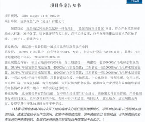 據(jù)悉,該項目位于通遼市扎魯特旗通遼市扎魯特旗魯北產(chǎn)業(yè)園,由遠(yuǎn)景綠色氣體(通遼)有限公司實施,項目總投資98.4億元,計劃建設(shè)起止年限:2024/03至2028/08。