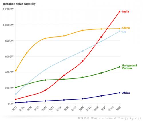 近年來,印度光伏市場發(fā)展迅速,光伏裝機(jī)始終保強(qiáng)勁增長。截至2023年6月30日,印度可再生能源發(fā)電的累計(jì)裝機(jī)容量達(dá)到129.6GW,太陽能約占可再生能源總裝機(jī)容量的54%。美國能源信息署(IEA) 《國際能源展望》報(bào)告預(yù)測稱,至2050年,印度的太陽能裝機(jī)容量將在全球占據(jù)主導(dǎo)地位。