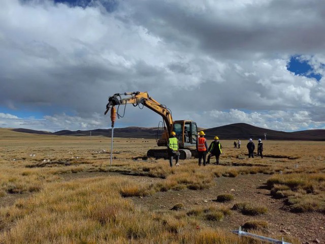 在西藏華電那曲色尼區(qū)12萬(wàn)千瓦光伏發(fā)電電力保供項(xiàng)目工地,工人們正安裝螺旋樁。