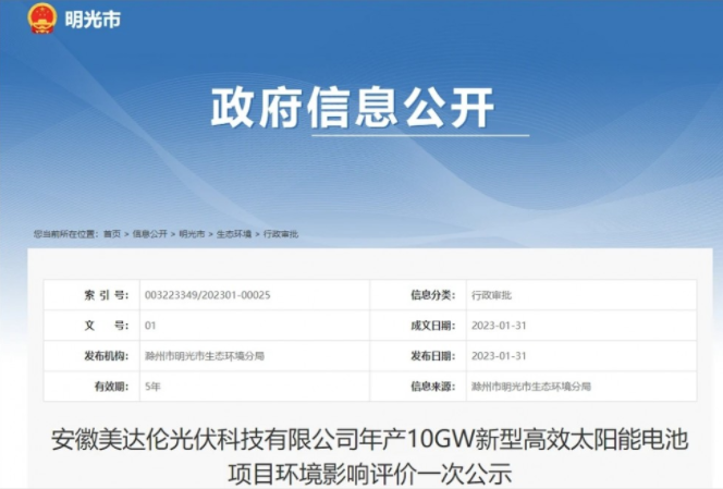 安徽美達(dá)倫光伏科技有限公司年產(chǎn)10GW新型高效太陽(yáng)能電池項(xiàng)目,總投資42.06億元,項(xiàng)目位于安徽省明光市產(chǎn)城新區(qū)寶塔山路以東、魯山路以西、淮河大道以北,占地275畝,總建筑面積11萬(wàn)平方米,項(xiàng)目計(jì)劃建設(shè)生產(chǎn)廠房、倉(cāng)庫(kù)、綜合樓等,配套建設(shè)道路、供配電、給排水等基礎(chǔ)設(shè)施,購(gòu)置單晶制絨清洗機(jī)、管式硼擴(kuò)散爐等生產(chǎn)設(shè)備,形成年產(chǎn)10GW新型高效太陽(yáng)能電池的生產(chǎn)能力。
