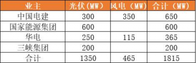 而在儲(chǔ)備項(xiàng)目庫中共9個(gè)項(xiàng)目,1.815GW。其中5個(gè)光伏項(xiàng)目,共計(jì)1.35GW;4個(gè)風(fēng)電項(xiàng)目共計(jì)465MW。中國電建650MW,國家能源集團(tuán)規(guī)模600MW,華電365MW,三峽200MW。具體如下: