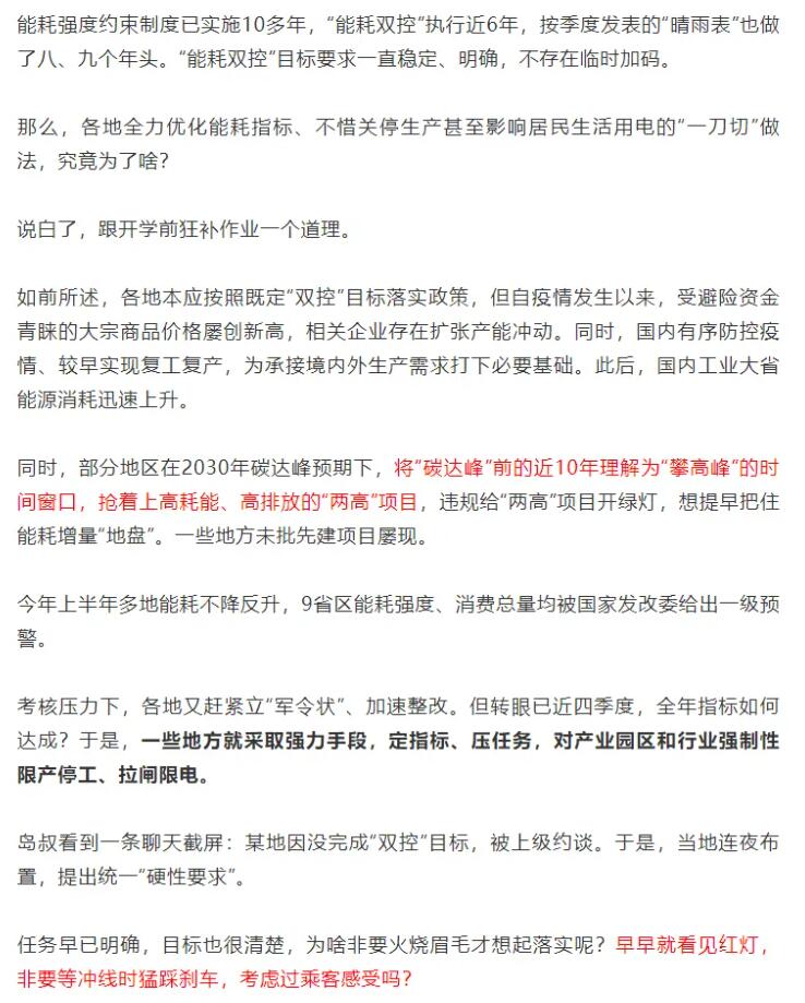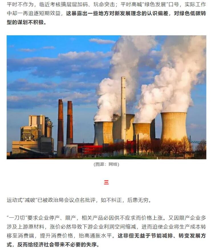 在這一政策的影響下,各地政府層層加碼,許多企業(yè)生產(chǎn)陷入停滯,甚至有部分地區(qū)居民生活用電、用水也受到影響。對(duì)此,人民日?qǐng)?bào)海外版《俠客島》評(píng)論稱(chēng),平時(shí)不作為,臨近考核搞層層加碼、玩命突擊;平時(shí)高喊“綠色發(fā)展”口號(hào),實(shí)際工作中卻一再追逐短期效益,這暴露出一些地方對(duì)新發(fā)展理念的認(rèn)識(shí)偏差,對(duì)綠色低碳轉(zhuǎn)型的謀劃不積極,“跟開(kāi)學(xué)前狂補(bǔ)作業(yè)一個(gè)道理。”