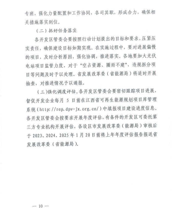 為深入貫徹碳達(dá)峰、碳中和重大戰(zhàn)略決策,加快發(fā)展可再生能源,實施可再生能源替代行動,提升我省開發(fā)區(qū)能源自供給能力,我委編制了《江西省整體推進開發(fā)區(qū)屋頂光伏建設(shè)三年行動計劃( 2022-2024年)》,經(jīng)委主任辦公會審議通過后印發(fā)給你們,請認(rèn)真貫徹執(zhí)行。各設(shè)區(qū)市發(fā)展改革委(能源局)于3月10日前將轄區(qū)內(nèi)各省級以上開發(fā)區(qū)開發(fā)方案報送我委。