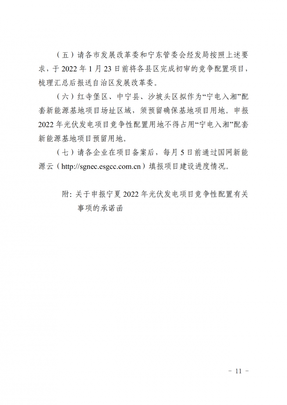 紅寺堡區(qū)、中寧縣、沙坡頭區(qū)擬作為“寧電入湘”配套新能源基地項(xiàng)目場(chǎng)址區(qū)域,須預(yù)留確?;仨?xiàng)目用地。申報(bào)2022年光伏發(fā)電項(xiàng)目競(jìng)爭(zhēng)性配置用地不得占用“寧電入湘”配套新能源基地項(xiàng)目預(yù)留用地。
