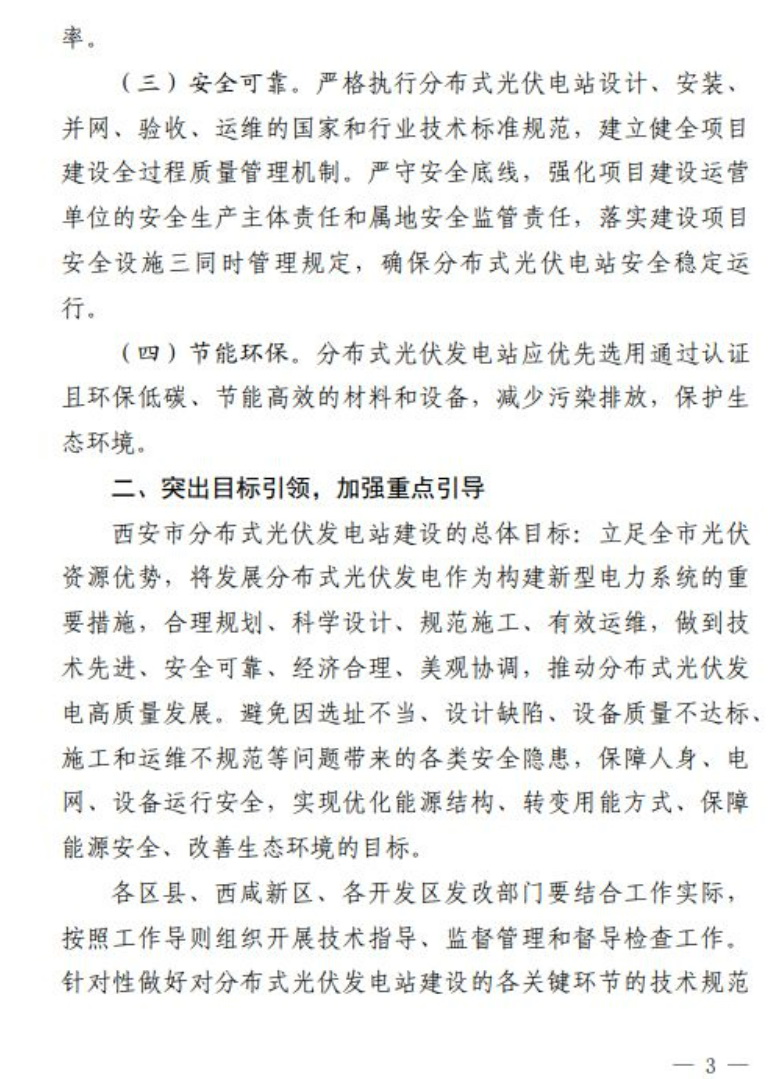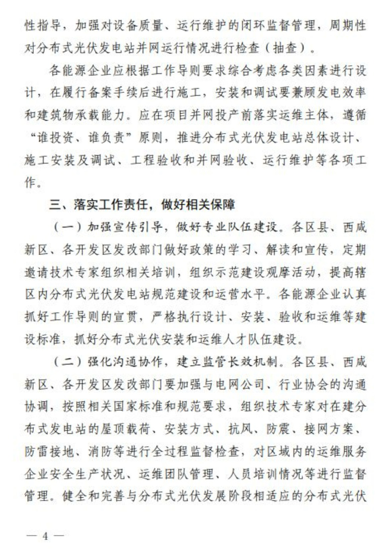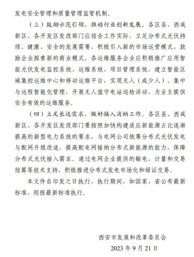 9月21日,西安市發(fā)改委發(fā)布《推進(jìn)西安市分布式光伏電站建設(shè)工作導(dǎo)則(試行)》的通知,分布式光伏發(fā)電站可采用“自發(fā)自用”“自發(fā)自用,余電上網(wǎng)”或者“全額上網(wǎng)”等并網(wǎng)模式,所有新建、擴(kuò)建或改建的分布式光伏發(fā)電站,履行項(xiàng)目備案、設(shè)計(jì)、安裝和驗(yàn)收程序;戶用(自然人)分布式光伏發(fā)電站裝機(jī)容量原則上不超過50kW,且不得超過超出宅基地范圍;非自然人分布式光伏發(fā)電站單點(diǎn)并網(wǎng)裝機(jī)容量不超過6000kW,整村開發(fā)模式在電網(wǎng)無消納受限的區(qū)域,不設(shè)容量規(guī)模限制。