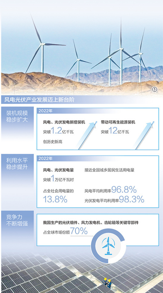 出口總額超過512億美元,同比增長80.3%——2022年,我國光伏產業(yè)在國際市場的表現(xiàn)亮眼。歷經多年深耕細作,我國風電光伏產業(yè)競爭力大幅提升,光伏組件、風力發(fā)電機、齒輪箱等關鍵零部件占全球市場份額的比重提升至70%。在國內,風電光伏也已成為新增發(fā)電裝機和新增發(fā)電量的主體,2022年占比分別達到78%和55%以上,累計裝機突破7億千瓦,相當于30多個三峽電站。