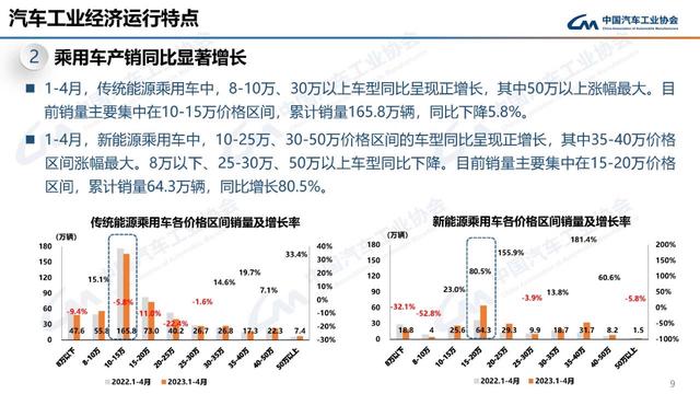 1-4月,傳統(tǒng)能源乘用車中,8-10萬、30萬以上車型同比呈現(xiàn)正增長,其中50萬以上漲幅最大。目前銷量主要集中在10-15萬價格區(qū)間,累計銷量165.8萬輛,同比下降5.8%。
