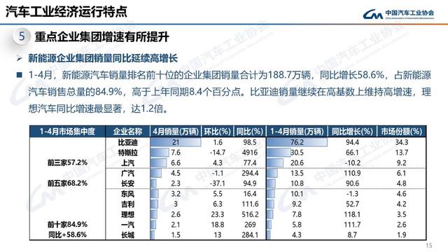 新能源企業(yè)集團銷量同比延續(xù)高增長。1-4月,新能源汽車銷量排名前十位的企業(yè)集團銷量合計為188.7萬輛,同比增長58.6%,占新能源汽車銷售總量的84.9%,高于上年同期8.4個百分點。比亞迪銷量繼續(xù)在高基數(shù)上維持高增速,理想汽車同比增速最顯著,達1.2倍。