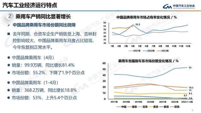具體看,中國品牌乘用車市場份額同比微降。去年同期,合資車企生產銷售受上海、吉林封控影響較大,中國品牌乘用車月度占比較高,今年恢復到正常水平。