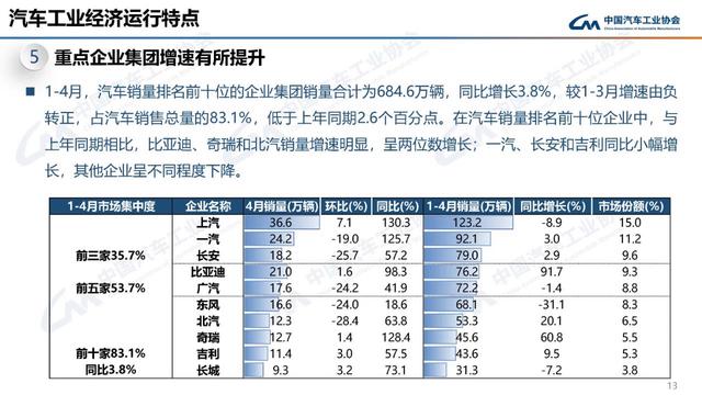 五是重點企業(yè)集團增速有所提升。1-4月,汽車銷量排名前十位的企業(yè)集團銷量合計為684.6萬輛,同比增長3.8%,較1-3月增速由負轉正,占汽車銷售總量的83.1%,低于上年同期2.6個百分點。在汽車銷量排名前十位企業(yè)中,與上年同期相比,比亞迪、奇瑞和北汽銷量增速明顯,呈兩位數(shù)增長,一汽、長安和吉利同比小幅增長,其他企業(yè)呈不同程度下降。