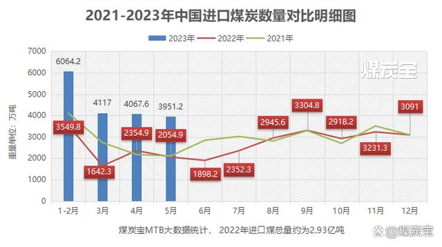 海關(guān)總署6月7日數(shù)據(jù)顯示,2023年5月份,我國(guó)進(jìn)口煤炭3951.2萬(wàn)噸,較去年同期的2054.9萬(wàn)噸增加1896.3萬(wàn)噸,增長(zhǎng)47.99%;較4月份的4067.6萬(wàn)噸減少116.4萬(wàn)噸,同比下降了2.7%。1-5月份我國(guó)累計(jì)進(jìn)口煤炭1.82億噸,增加89.6%,平均每噸為877元,下跌14.9%。