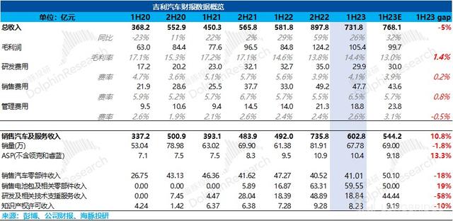 2023 年上半年,公司整車銷售業(yè)務(wù)實現(xiàn)營收 603 億元,同比增 23%,超出市場預(yù)期 10.8%。在銷量(不含領(lǐng)克、睿藍)同比增長 12% 的但銷量數(shù)據(jù)市場已知的情況下,單車 ASP 超出市場預(yù)期 13.3%,帶動整車銷售業(yè)務(wù)大幅度超預(yù)期。