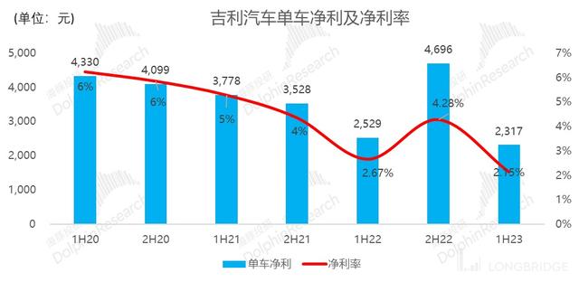 2023 年上半年吉利汽車實現(xiàn)歸母凈利潤 15.7 億元,同比增長約 1%,略超市場預(yù)期 15.1 億元。但凈利率下滑從 2022 年上半年 2.7% 下滑至 2023 年上半年 2.2%, 單車凈利也從 2529 元降低至 2317 元。