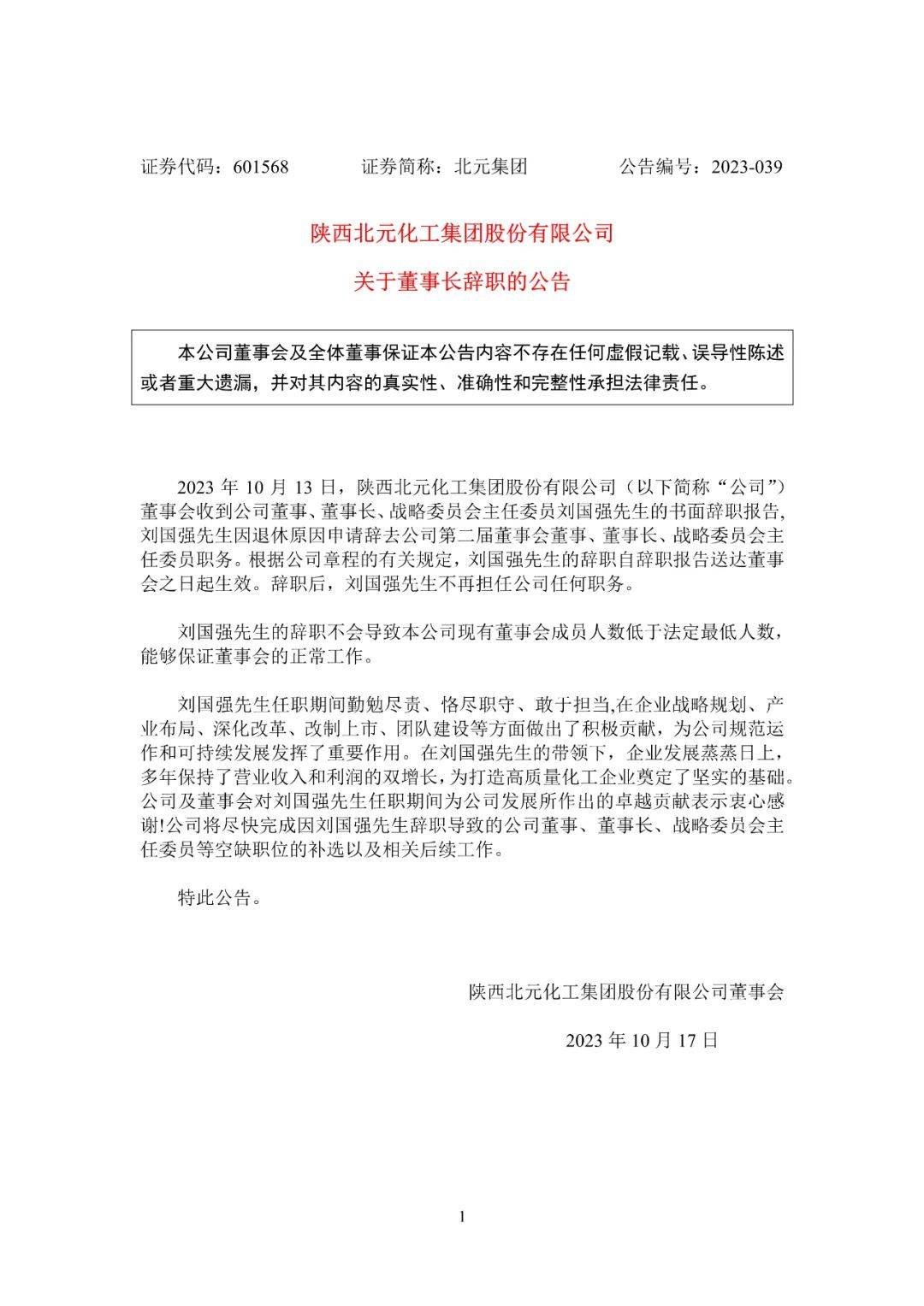 北元集團10月16日發(fā)布公告稱,10月13日,公司董事會收到董事、董事長、戰(zhàn)略委員會主任委員劉國強先生的書面辭職報告, 劉國強因退休原因申請辭去公司第二屆董事會董事、董事長、戰(zhàn)略委員會主任委員職務(wù)。