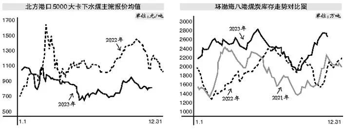 從10月中旬開始,市場(chǎng)煤價(jià)格進(jìn)入一個(gè)回落期,下跌趨勢(shì)一直延續(xù)到11月初。價(jià)格回落后,貿(mào)易商看漲情緒升溫,詢貨有所增多,加上第一次寒流來(lái)襲且水電進(jìn)入快速回落期,煤炭市場(chǎng)受到一定帶動(dòng),價(jià)格企穩(wěn)反彈。隨后在高庫(kù)存的壓制下,市場(chǎng)情緒又開始轉(zhuǎn)弱。進(jìn)入11月下旬,當(dāng)港口5000大卡下水煤價(jià)格再次回落至每噸800元左右時(shí),供應(yīng)方出貨意愿降低,疊加第二波寒潮降溫來(lái)臨,市場(chǎng)對(duì)電廠日耗回升有一定預(yù)期,價(jià)格小幅反彈。但這波寒潮影響時(shí)間較短,后續(xù)多地氣溫有所回升,且沿海地區(qū)受影響較小,電廠日耗環(huán)比增速略有放緩。電廠在高庫(kù)存的情況下,對(duì)高價(jià)接受程度有限,疊加港口高庫(kù)存疏港壓力加大,市場(chǎng)煤價(jià)格反彈支撐不足,短暫上漲后開始企穩(wěn)。