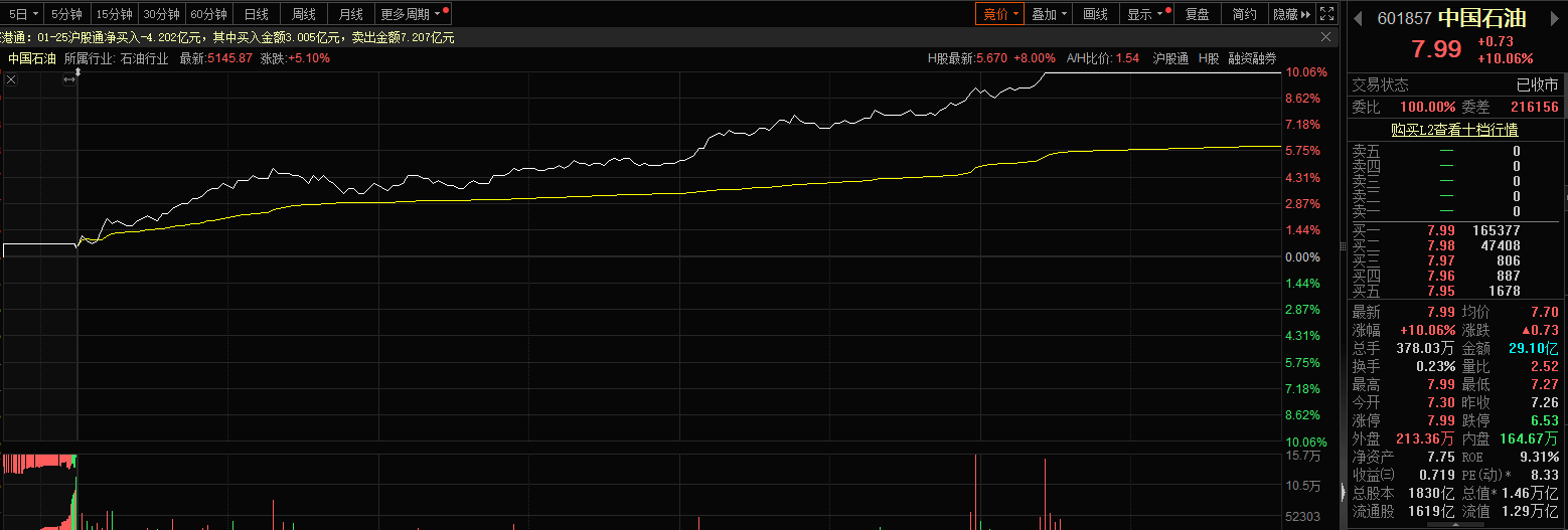 11月25日萬億巨頭中國石油實(shí)現(xiàn)漲停,為2015年7月以來首次。截至收盤,漲幅為10.06%,股價(jià)報(bào)7.99元,市值達(dá)1.46萬億,成交金額為29.10億元。