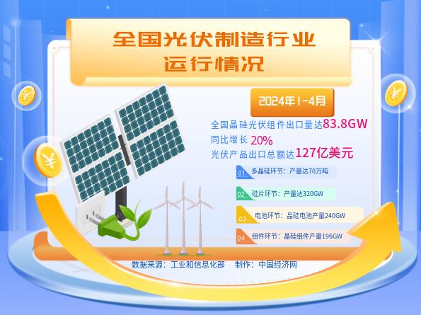 工業(yè)和信息化部12日發(fā)布2024年1-4月全國光伏制造行業(yè)運(yùn)行情況。數(shù)據(jù)顯示,1-4月,我國光伏產(chǎn)業(yè)總體保持高位運(yùn)行。