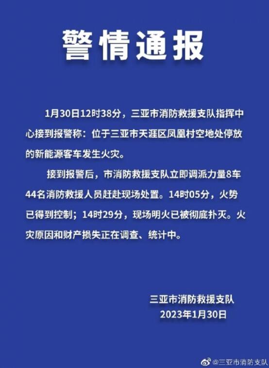 另據(jù)三亞市消防支隊通報稱,30日12時38分,三亞市消防救援支隊指揮中心接到報警稱:位于三亞市天涯區(qū)鳳凰村空地處停放的新能源客車發(fā)生火災(zāi)。支隊調(diào)派8車44名消防救援人員趕赴現(xiàn)場處置。14時05分,火勢已得到控制;14時29分,現(xiàn)場明火已被徹底撲滅。火災(zāi)原因和財產(chǎn)損失正在調(diào)查、統(tǒng)計中。