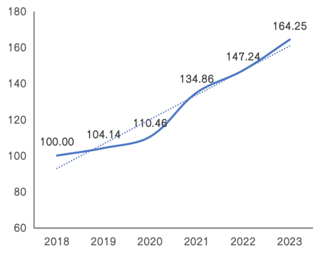 指數(shù)結(jié)果顯示,2023年,內(nèi)蒙古現(xiàn)代能源經(jīng)濟(jì)發(fā)展指數(shù)高速增長,達(dá)164.25點(diǎn),同比增長11.55%,基期以來年均復(fù)合10.43%,發(fā)展質(zhì)速較前期進(jìn)一步提升。從分項(xiàng)指數(shù)看,低碳轉(zhuǎn)型、創(chuàng)新驅(qū)動(dòng)、經(jīng)濟(jì)高效和社會(huì)貢獻(xiàn)四大維度發(fā)展均穩(wěn)中向好、好中有進(jìn)、進(jìn)中蓄勢,在錯(cuò)綜復(fù)雜的國內(nèi)外形勢挑戰(zhàn)下彰顯了內(nèi)蒙古現(xiàn)代能源經(jīng)濟(jì)的活力與潛力。