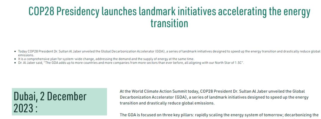 COP28 主席蘇丹·賈比爾周六宣布了“全球脫碳加速計(jì)劃”(GDA),該計(jì)劃專注于三個(gè)關(guān)鍵支柱:快速擴(kuò)展未來(lái)的能源系統(tǒng);促進(jìn)當(dāng)今的能源系統(tǒng)脫碳;并針對(duì)甲烷和其他非二氧化碳溫室氣體 (GHG)的行動(dòng)。